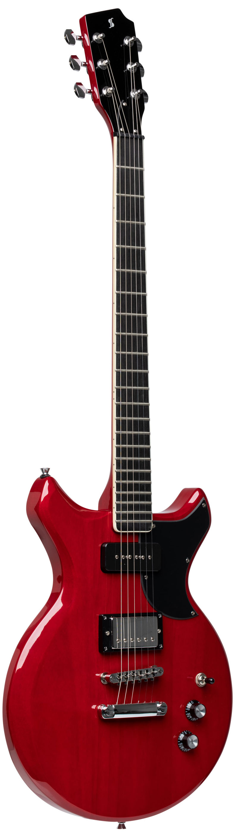 Электрогитара STAGG SVY DC TCH выполнена в корпусе из цельного красного дерева типа Les Paul с двумя вырезами. Гриф вклеенный сделан из красного дерева с глянцевой отделкой, накладка на гриф – из черного дерева. У гитары 22 лада. Используются струны D’Addario.