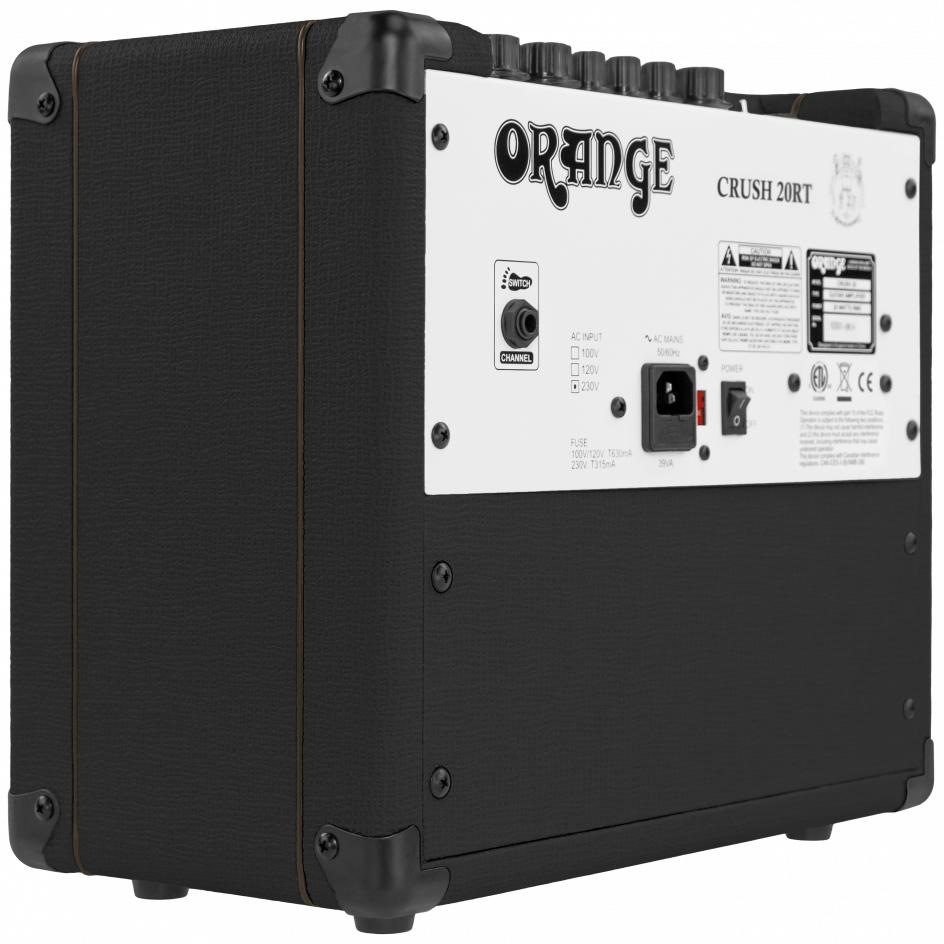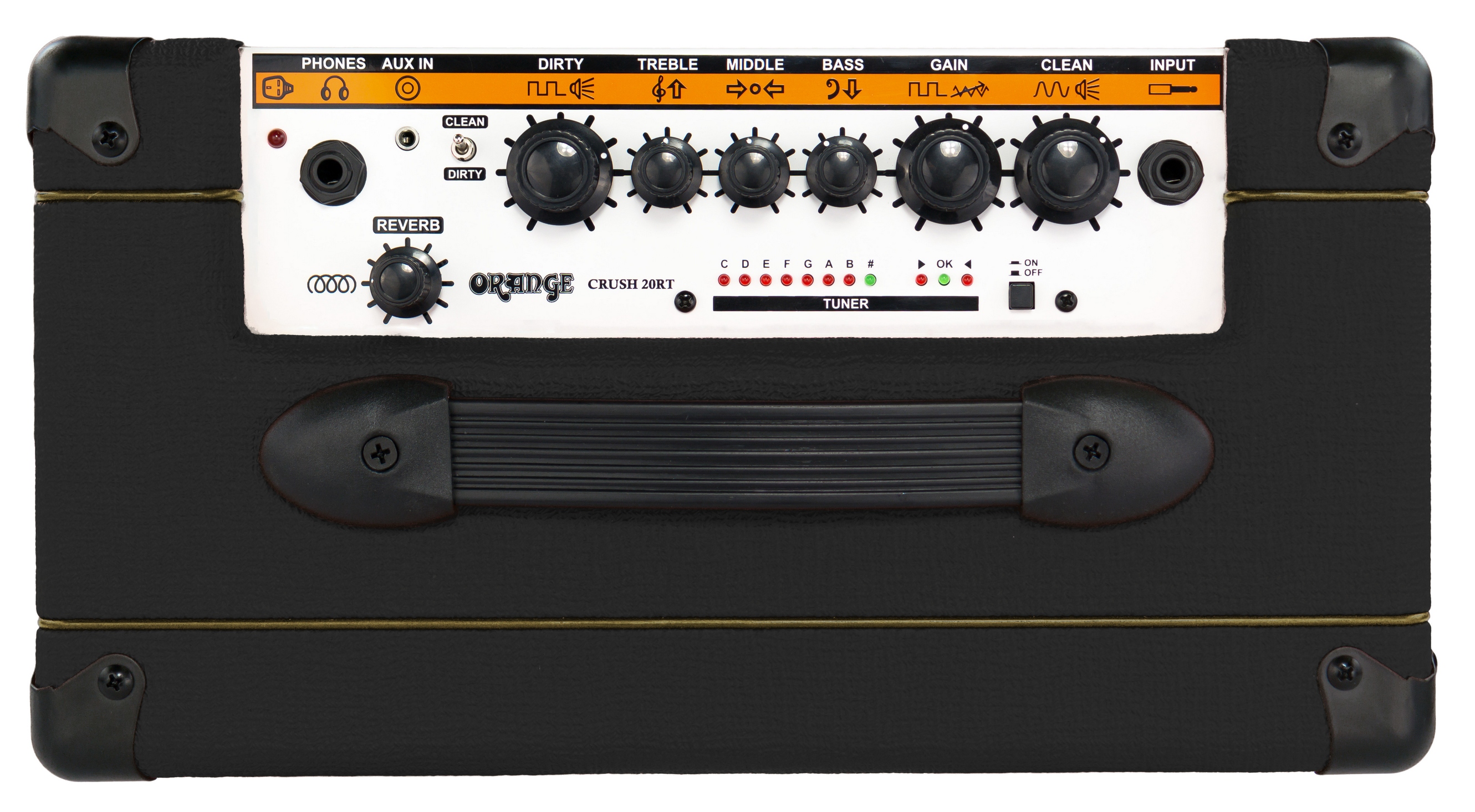 Orange CRUSH 20RT – это двухканальный транзисторный гитарный комбоусилитель, относящийся к известной серии Crush, которая включает в себя множество оборудования для начинающих музыкантов. Данная модель имеет аутентичный звук усилителей Orange и фирменный дизайн, неизменный с 1968 года.Для воспроизведения звука здесь установлен фирменный 8-дюймовый динамик of the World, который превосходно озвучивает как чистый, так и перегруженный тембр, отличаясь узнаваемым «британским» характером с выраженными средними частотами, а также мягкими высокими частотами без «песка». Максимальная выходная мощность усилителя равняется 20 Вт. Для исполнения есть два канала: Clean и Dirty. Последний предлагает достаточно широкий запас искажений, позволяя достичь как плотного и агрессивного хай-гейна, а так блюзового кранча. Для коррекции частотной характеристики имеется гибкий 3-полосный эквалайзер, а для настройки уровня искажений есть регулятор Gain. Придать звучанию объем и пространство можно с помощью встроенного цифрового эквалайзера типа Spring, управляемого лишь одной ручкой. Наконец, удобной работе способствует хроматический тюнер, посредством которого можно легко и точно настроить инструмент.