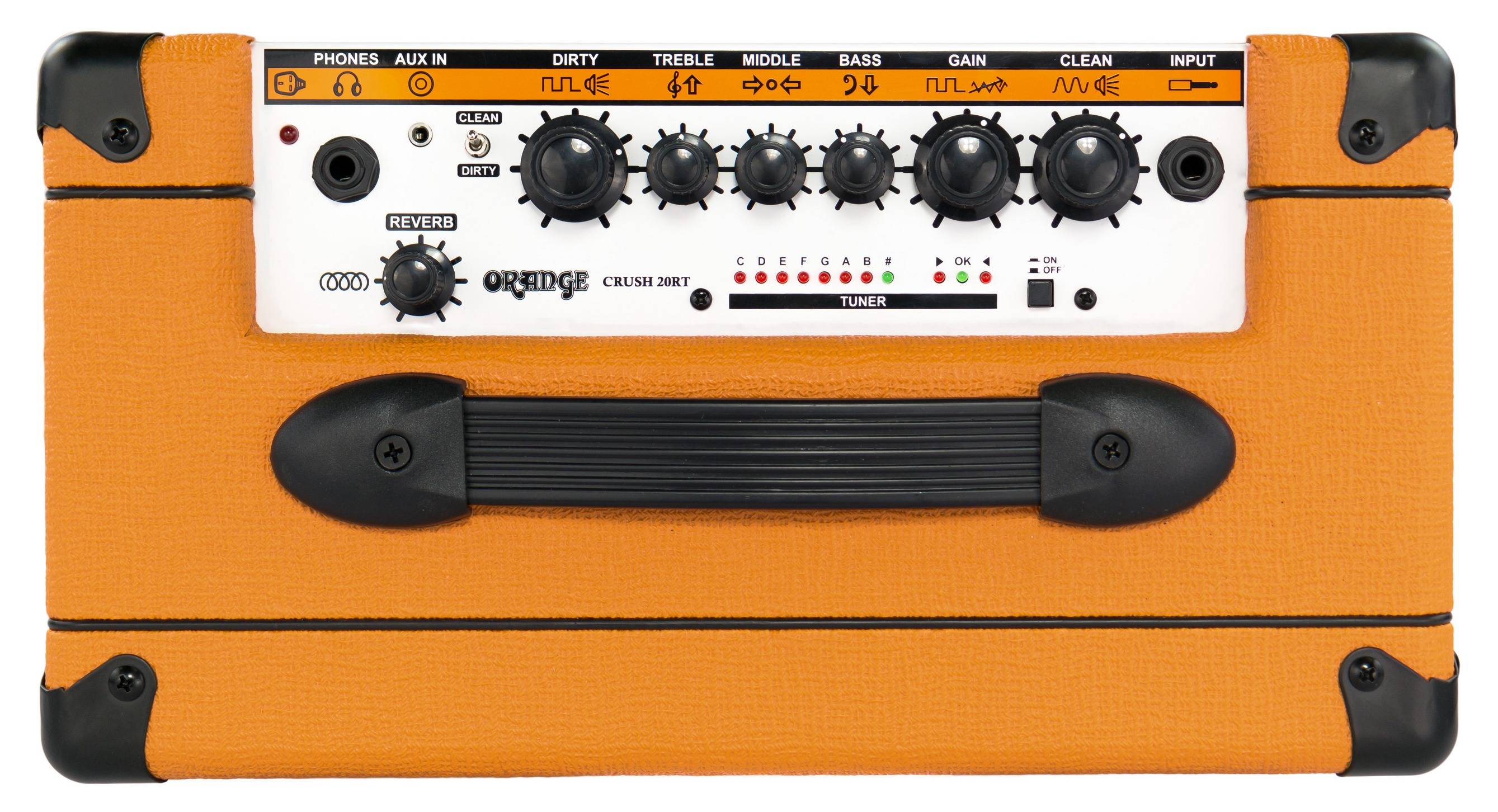 Orange CRUSH 20RT – это двухканальный транзисторный гитарный комбоусилитель, относящийся к известной серии Crush, которая включает в себя множество оборудования для начинающих музыкантов. Данная модель имеет аутентичный звук усилителей Orange и фирменный дизайн, неизменный с 1968 года.Для воспроизведения звука здесь установлен фирменный 8-дюймовый динамик of the World, который превосходно озвучивает как чистый, так и перегруженный тембр, отличаясь узнаваемым «британским» характером с выраженными средними частотами, а также мягкими высокими частотами без «песка». Максимальная выходная мощность усилителя равняется 20 Вт. Для исполнения есть два канала: Clean и Dirty. Последний предлагает достаточно широкий запас искажений, позволяя достичь как плотного и агрессивного хай-гейна, а так блюзового кранча. Для коррекции частотной характеристики имеется гибкий 3-полосный эквалайзер, а для настройки уровня искажений есть регулятор Gain. Придать звучанию объем и пространство можно с помощью встроенного цифрового эквалайзера типа Spring, управляемого лишь одной ручкой. Наконец, удобной работе способствует хроматический тюнер, посредством которого можно легко и точно настроить инструмент.