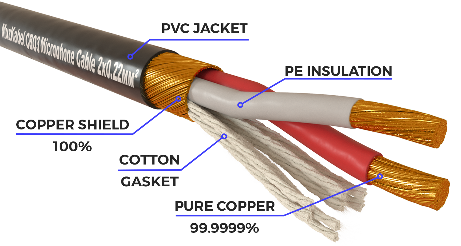 Шнур оснащен разъемами MuzKabel XLR - XLR и кабелем CB03 (2 х 0.22 мм²), который отвечает всем стандартам для микрофонных кабелей. Он имеет спиральное экранирование, диэлектрик PE, оболочку из ПВХ и контакты, покрытые позолотой. Внешний диаметр кабеля составляет 6,1 мм, а цвет - черный.