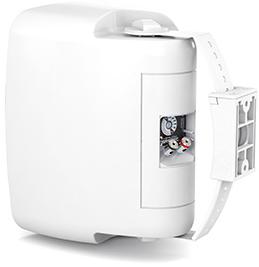 Модель оснащена настенным кронштейном, состоящим из металлической дуги и пластикового крепежного элемента, который позволяет поворачивать колонку в горизонтальной плоскости и задавать угол наклона. Акустическая система может работать в двух режимах: низкоомный (low-impedance) совместно с классическим усилителем и трансформаторный 100V/70V. Выбор режима и мощности в 100V осуществляется с помощью семипозиционного селектора на задней стороне корпуса. В низкоомном режиме номинальное сопротивление составляет 8Ω, мощность 40W RMS / 80W max. В трансформаторном режиме доступно шесть уровней мощности: 2/4/8/16/32W. Кабель фиксируется металлическими винтовыми зажимами и защищен от влаги резиновой заглушкой.