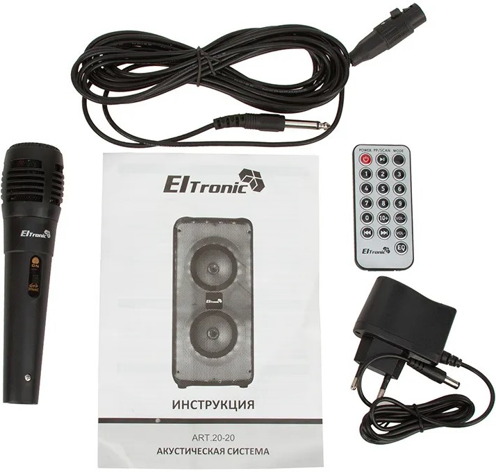 Микрофон проводной -1 шт, Пульт Д/У, Кабель питания |
