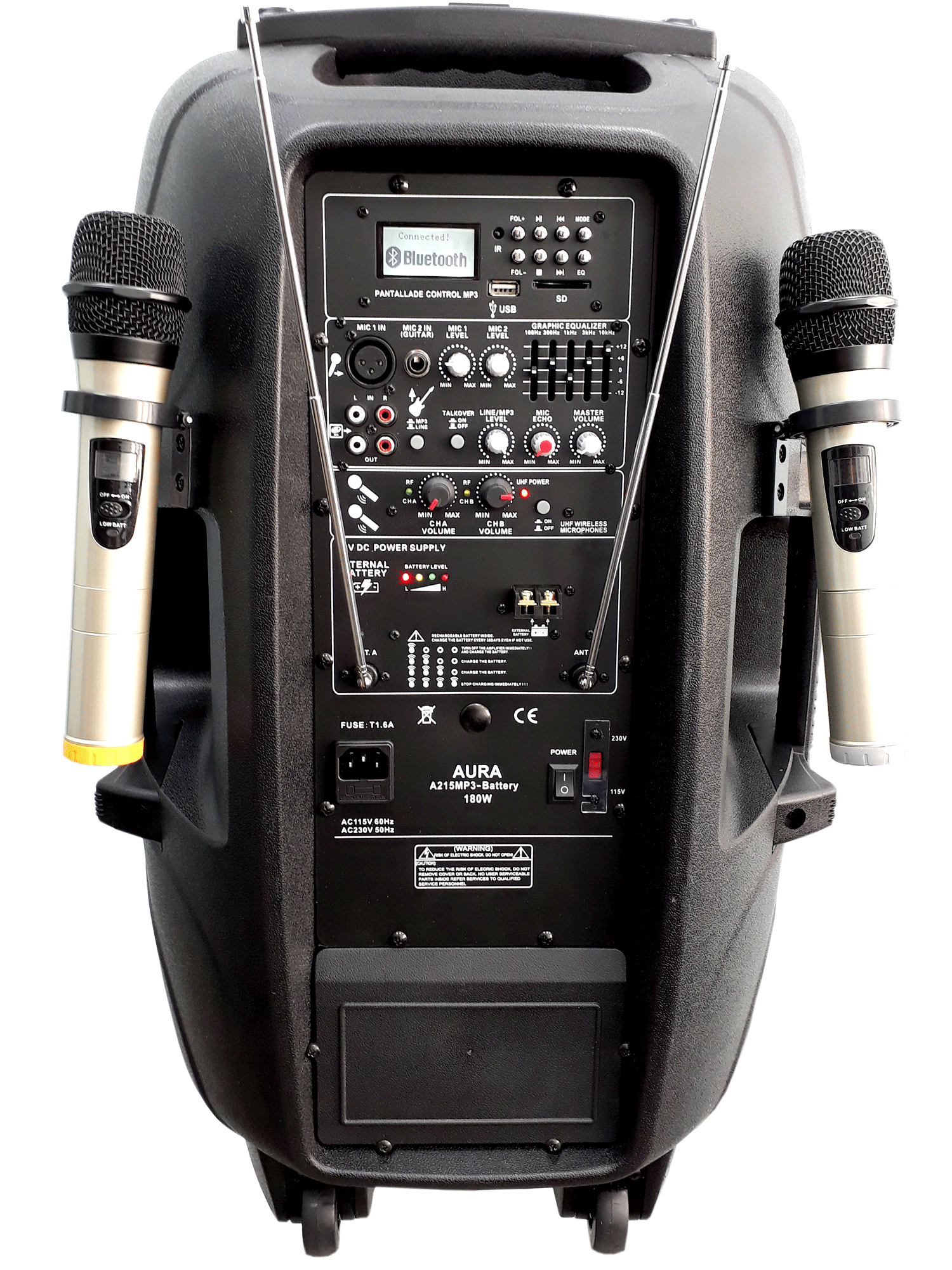 Автономная активная акустическая система с двумя радиомикрофонами Aura A215MP3-Battery - портативное устройство, мощностью 180 Вт. Акустическая система имеет два радиомикрофона в комплекте, разъем SD-карты, bluetooth, USB-разъем и даже FM-радио. Способно работать автономно, от аккумуляторной батареи. Всеми функциями прибора можно управлять с помощью пульта дистанционного управления. Для удобства транспортировки устройство снабжено колесиками и выдвижной ручкой. Кроме того, устройство можно закрепить на стандартной акустической стойке.