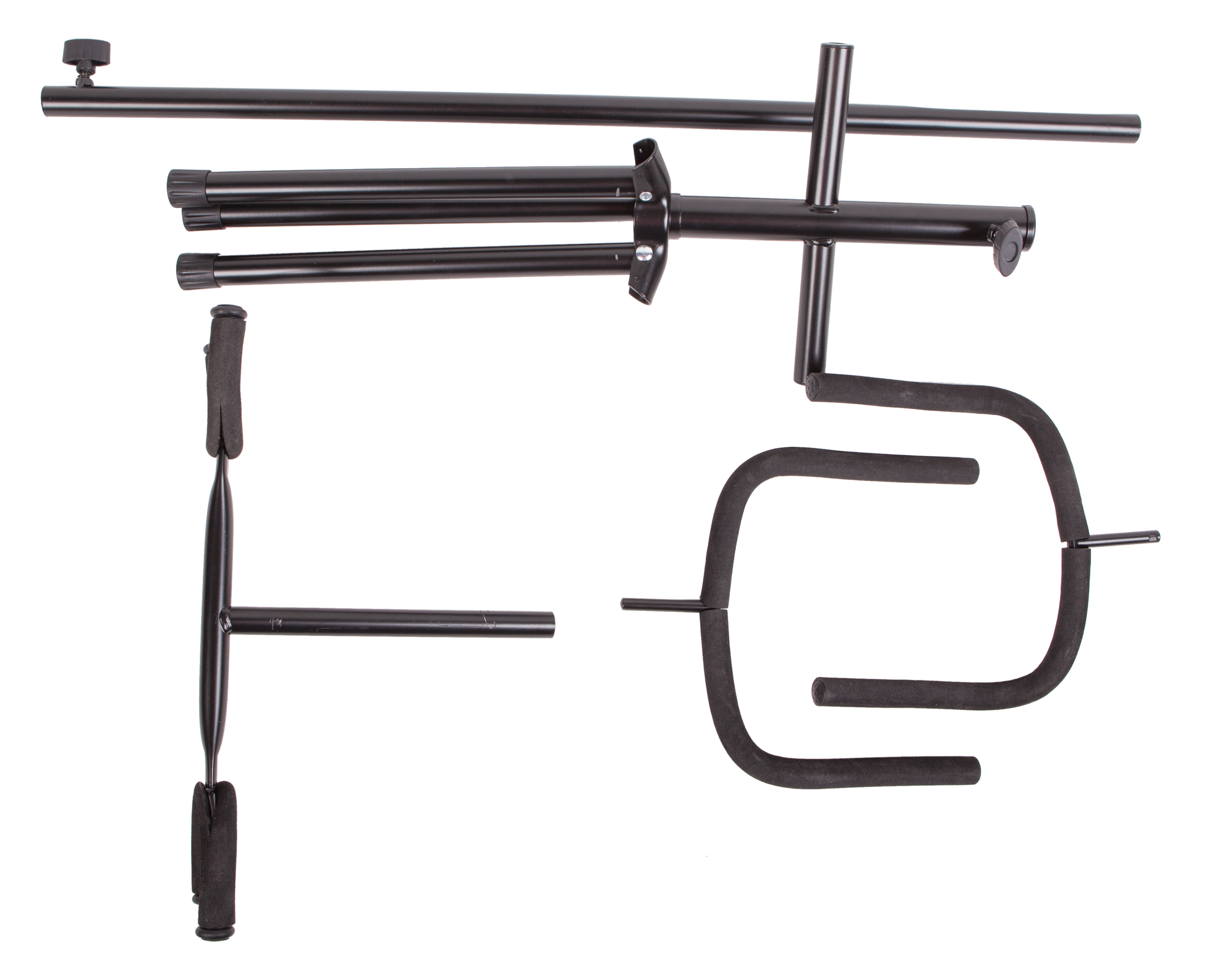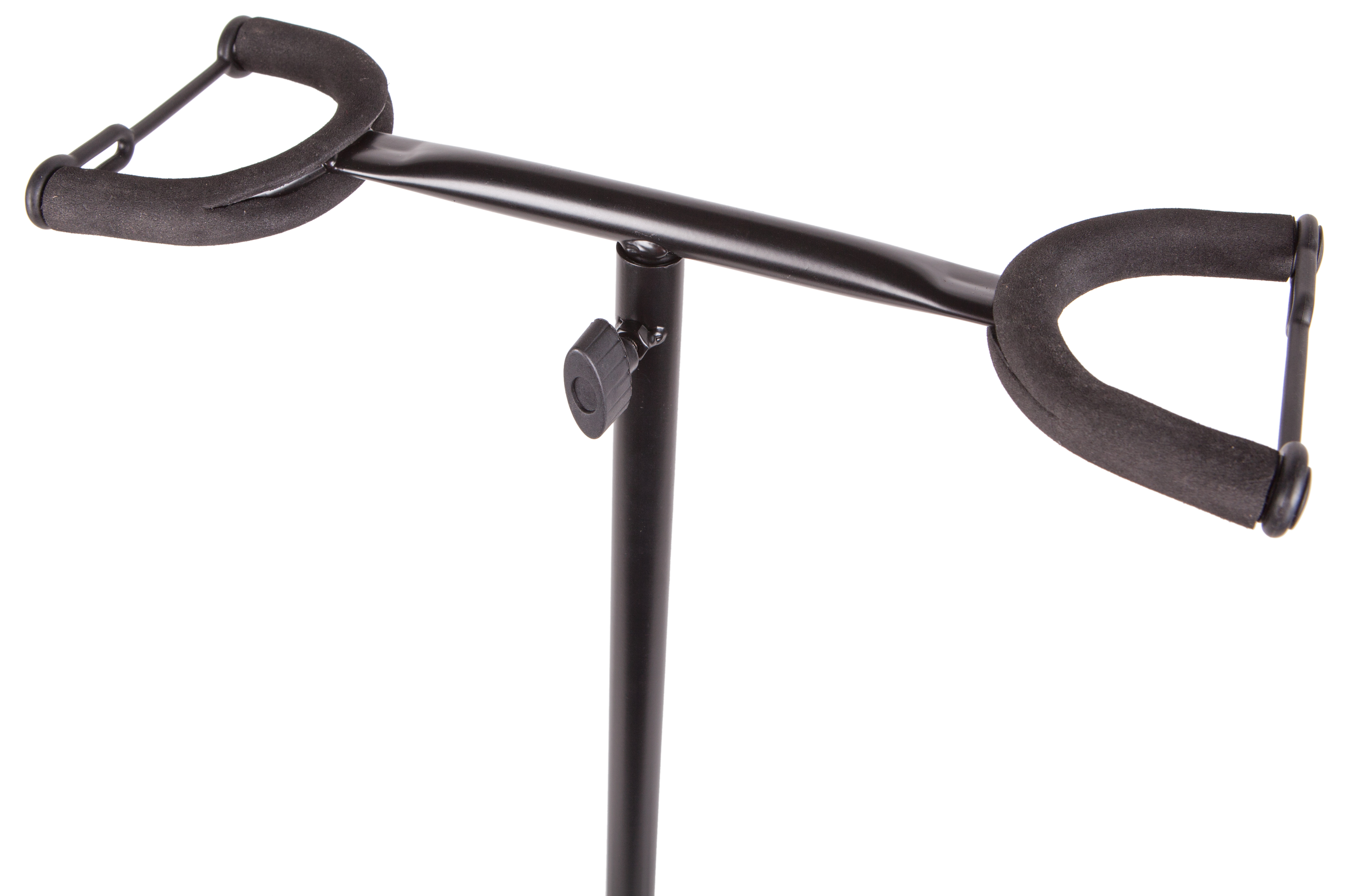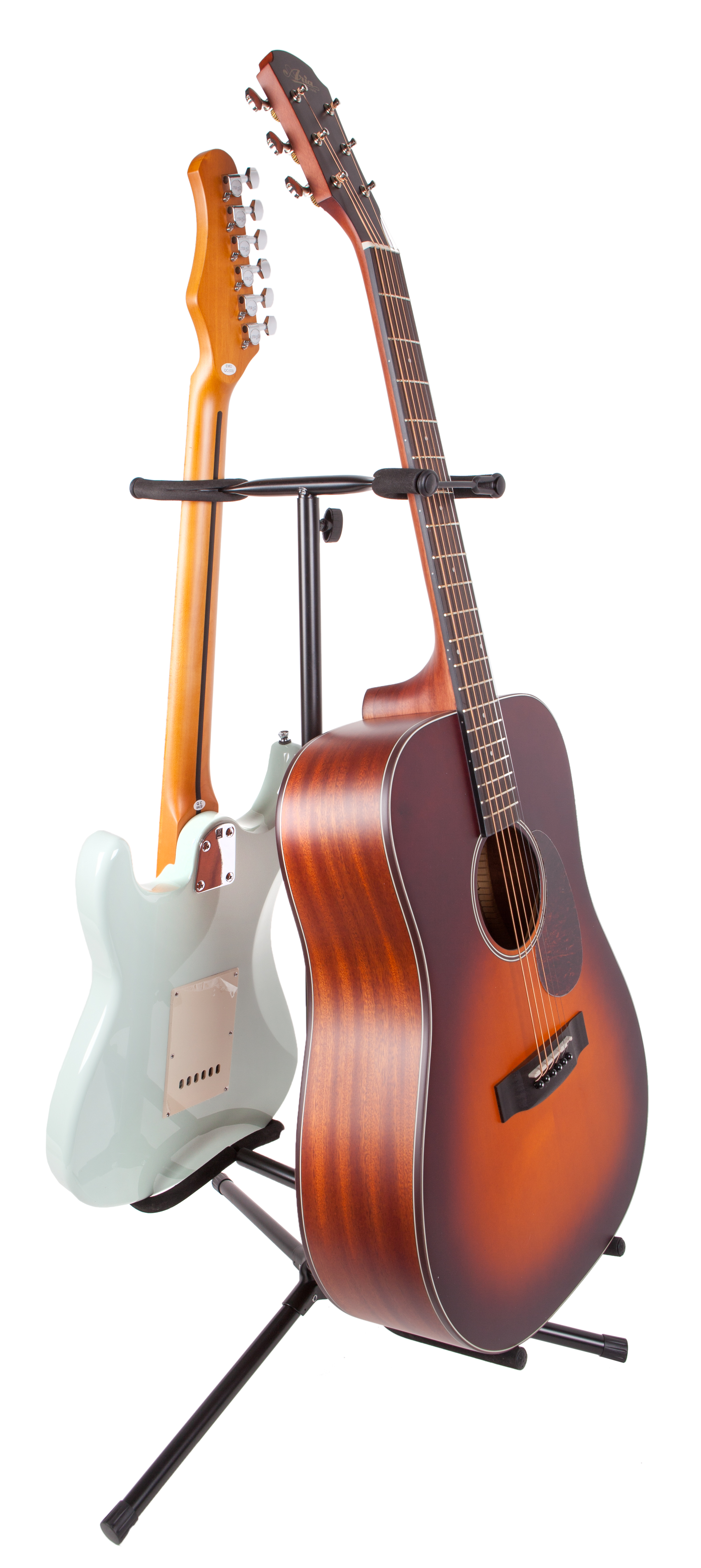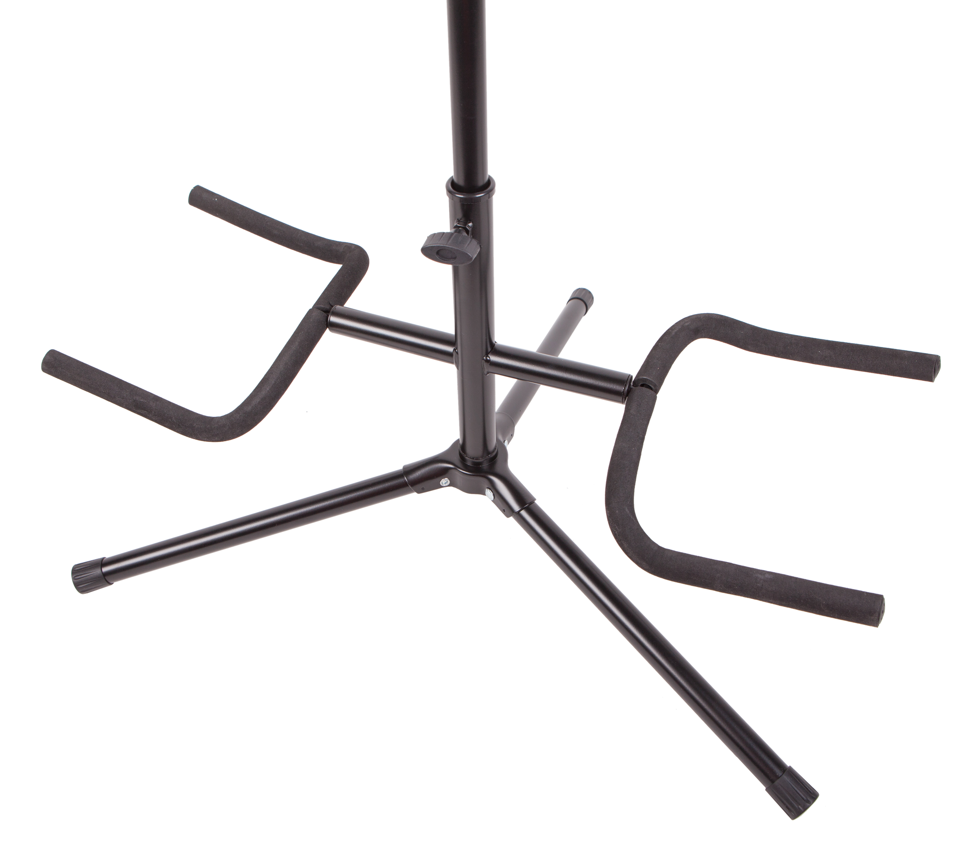 Двойная стойка с универсальным держателем и защитным держателем грифа для акустических, классических, электро и бас гитар. Вертикальная стойка с регулируемым защитным хомутом для грифа. Антискользящий натуральный каучук. Универсальные держатели адаптируются к любому инструменту.