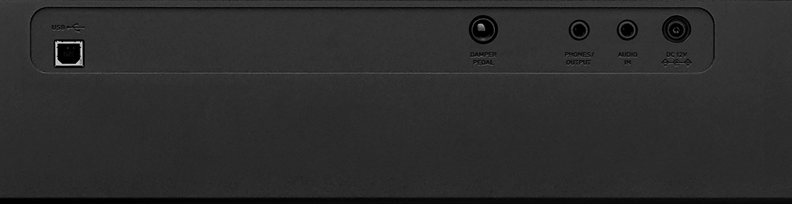 Разъемы: PHONES / OUTPUT: 1 (стерео мини джек), разъем для педали: 1 (демпфер), разъем AUDIO IN, USB типа B