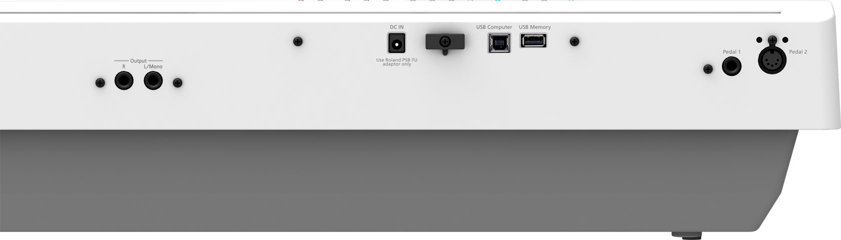 Разъемы (коммутация): Разъем для адаптера питания DC In, разъемы Pedal1, разъемы Pedal2 (Damper, Sostenuto, Soft) , выходные (L / Mono, R) разъемы, порт USB COMPUTER: USB тип B, порт USB MEMORY: USB тип A, 2 разъема для наушников