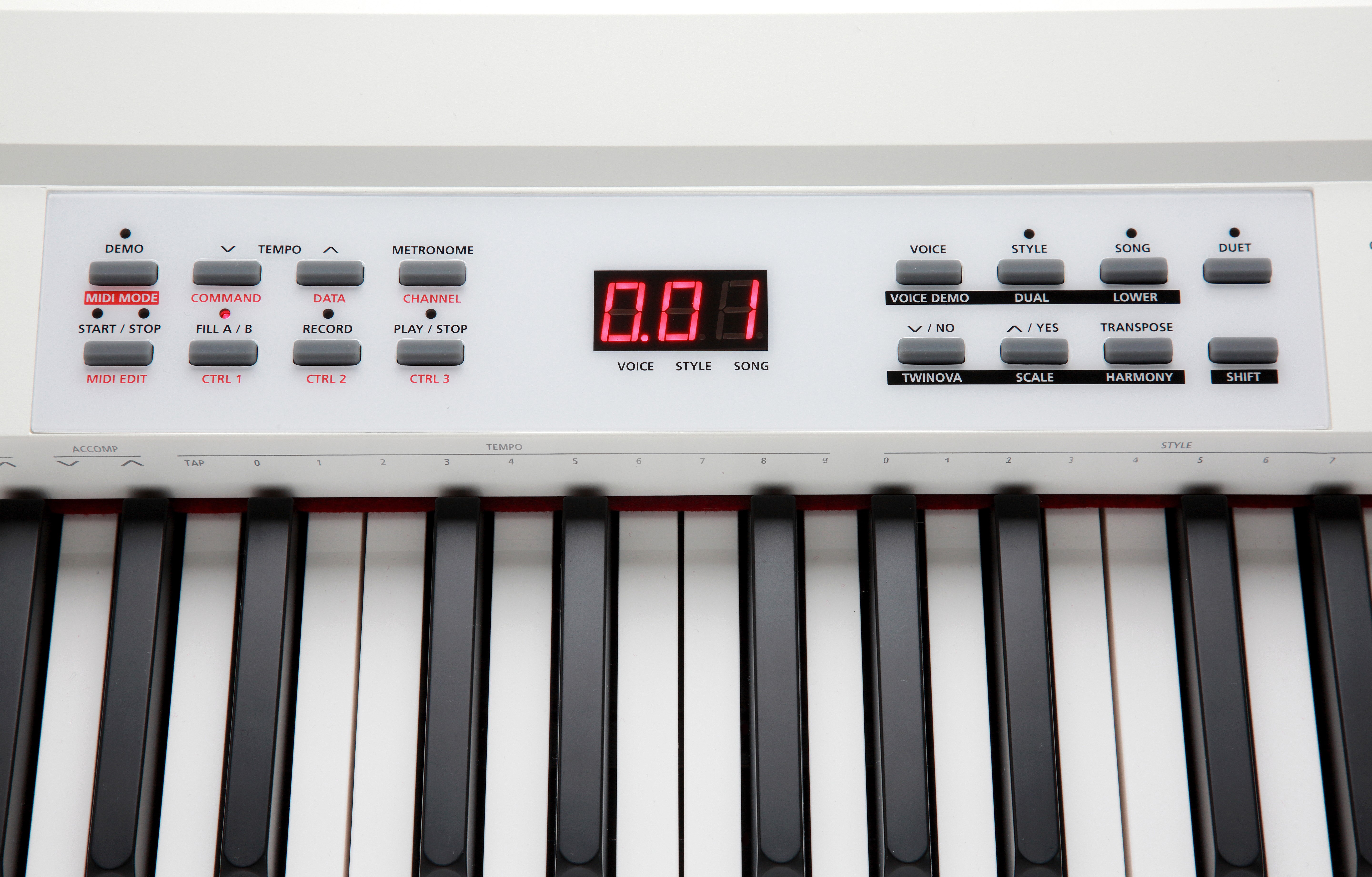 Все органы управления сконцентрированы на лицевой части корпуса. Для изменения высоты тона во время исполнения есть одно колесо Pitch, а значения параметров отображаются на встроенном ЖК-дисплее. Несмотря на компактность конструкции, здесь присутствует акустическая система с 4 динамика, общая мощность которых достигает 60 Вт. Это позволяет использовать инструмент не только на сцене, но и в условиях отсутствия звукоусиливающей аппаратуры.