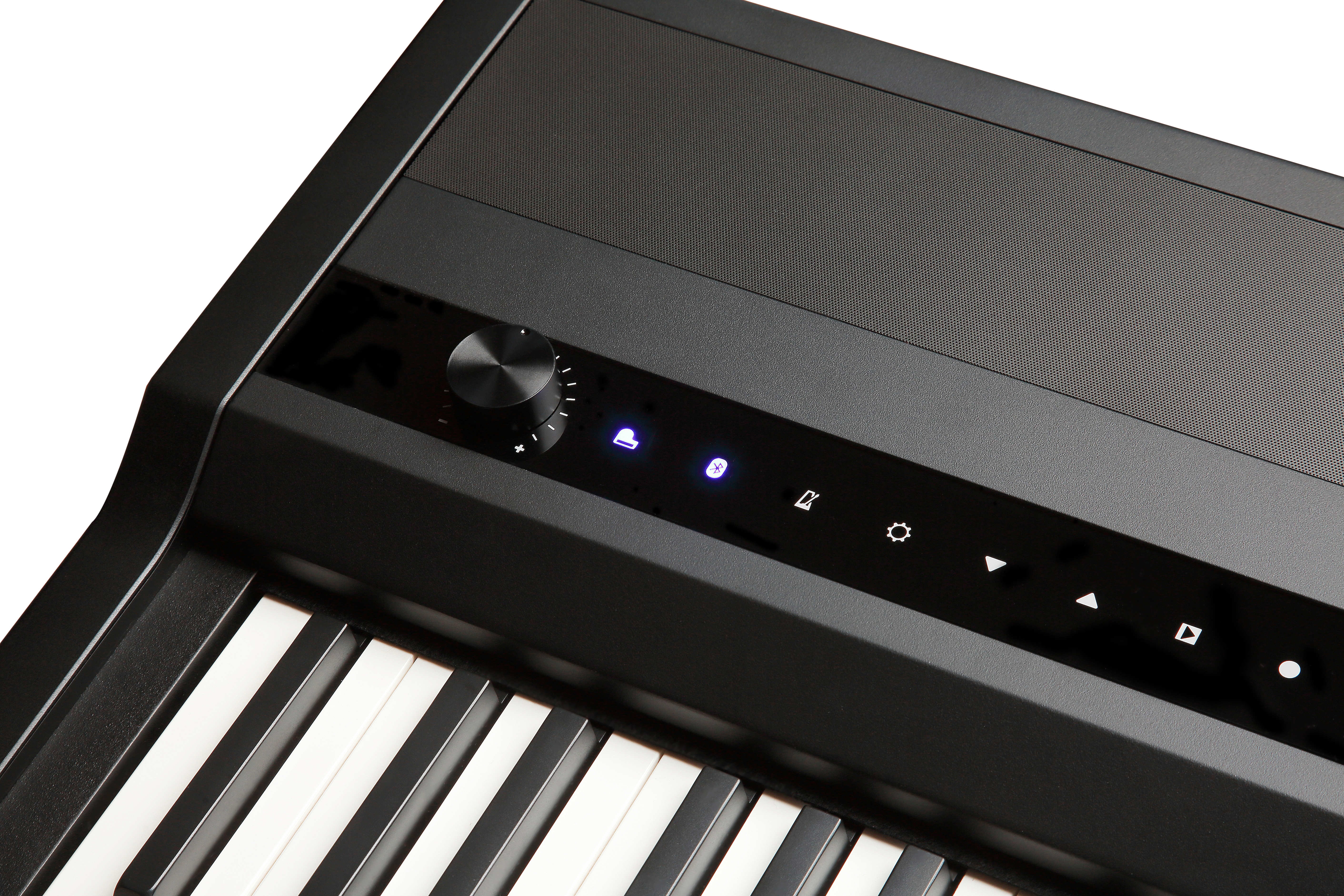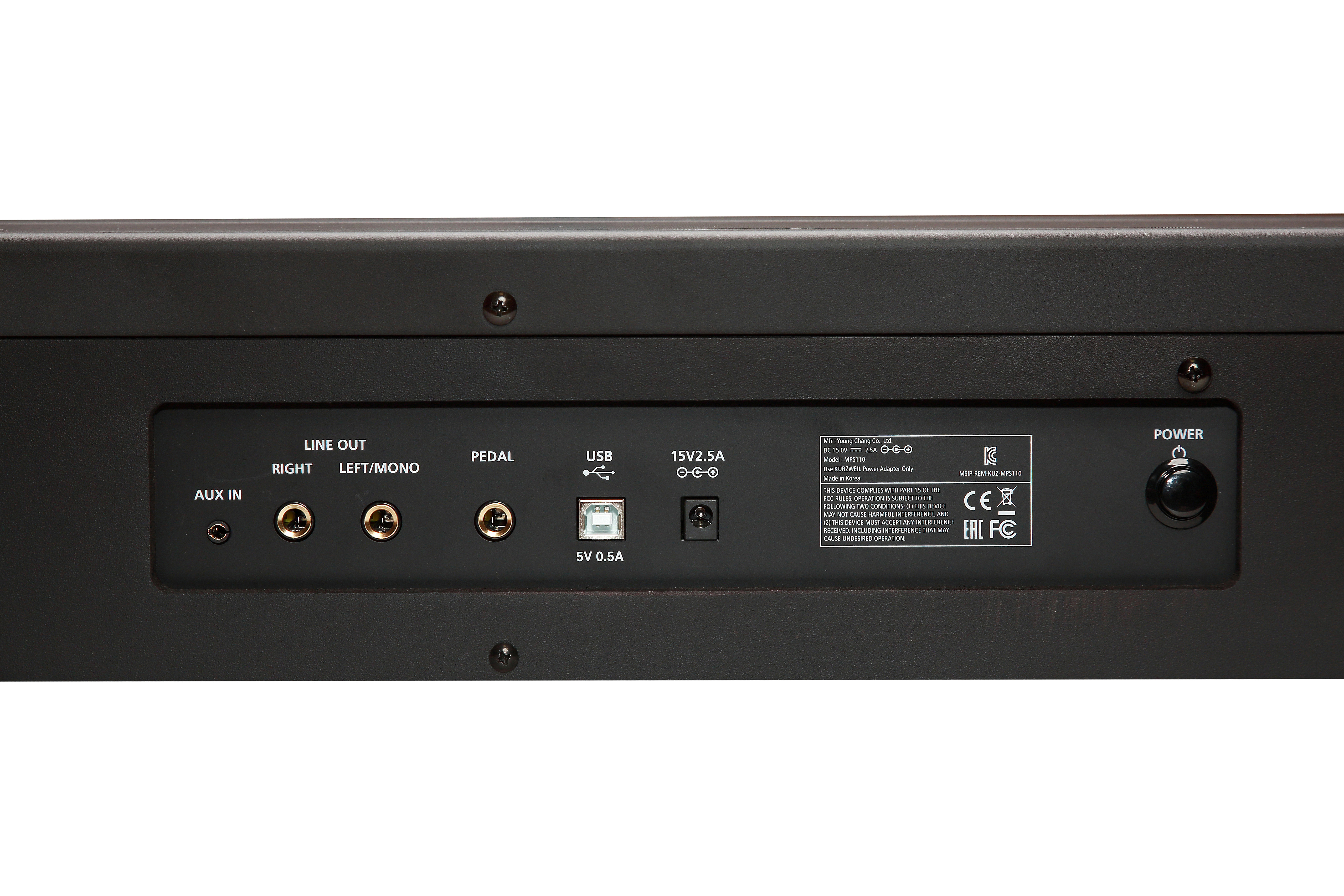 Встроенная акустическая система оснащена 4 динамиками и усилителем, обеспечивающим общую выходную мощность 24 Вт. Для подключения к компьютеру имеется порт USB-B: он позволяет осуществлять обмен MIDI-данными и записывать аудио в несжатом качестве. Питание происходит от комплектного адаптера на 15 V DC. Комплектация дополнительно включает в себя свитч KP-1, пюпитр, USB-кабель и кабель для смартфона.