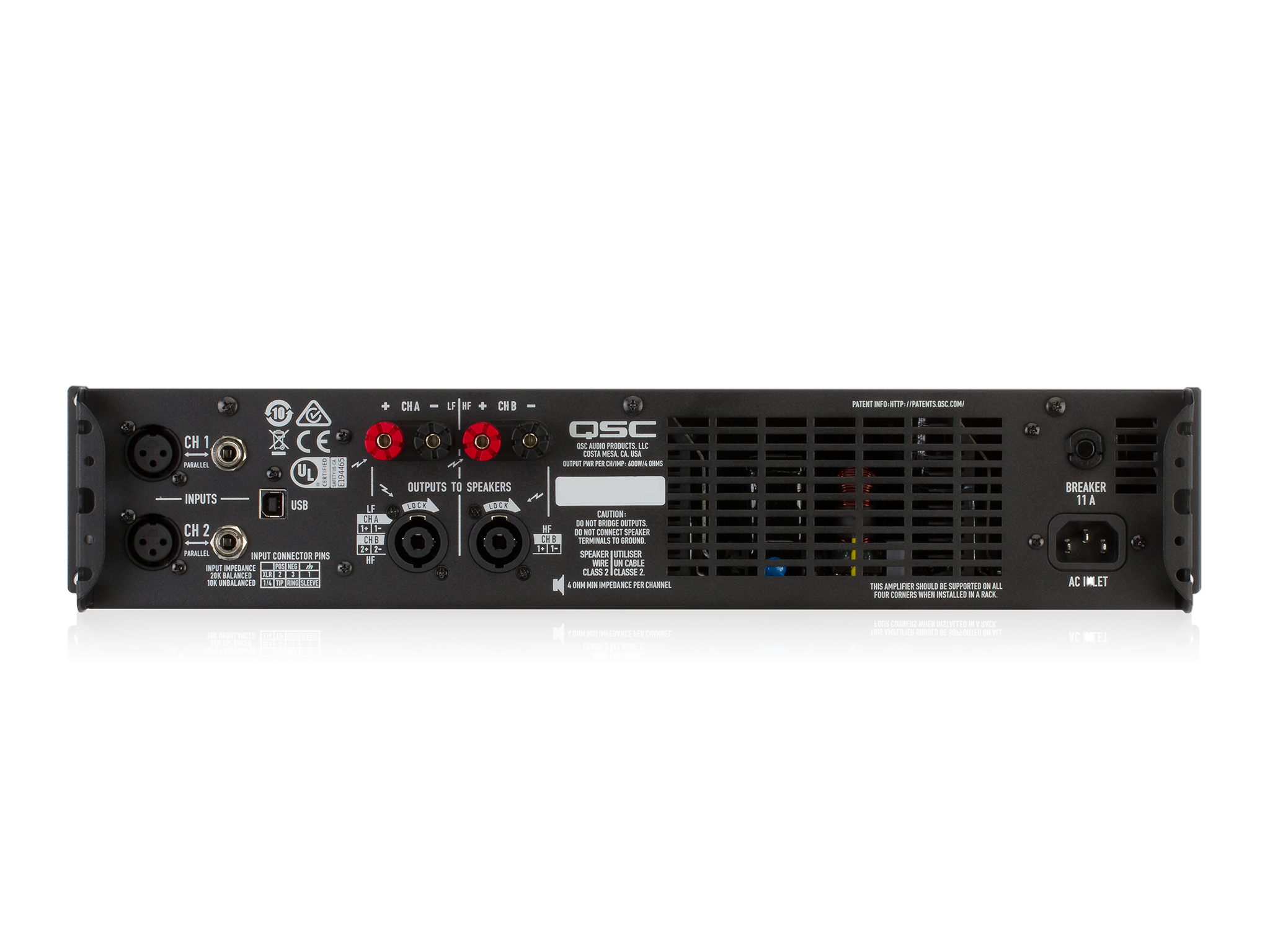На тыловой панели QSC GXD 4 также располагаются входные разъемы на XLR-F и 1/4" TRS JAck, которые позволят подсоединять разнообразные источники, и выходные разъемы на винтовых клеммах и Neutrik NL Speakon, отдельные для каждого канала. Наконец, на тыловой панели находится USB-разъем, предназначенный для подключения к компьютеру, обновления прошивки и управления конфигурацией усилителя в фирменном ПО Amplifier Navigator.