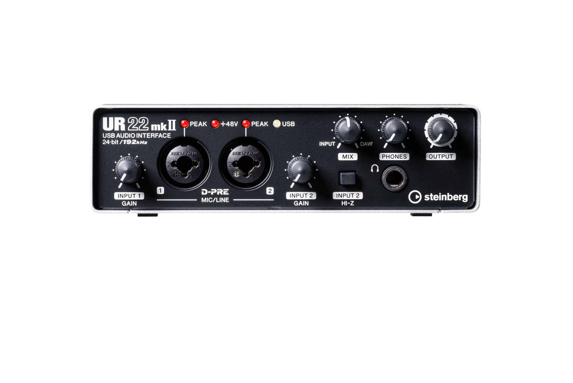Steinberg UR22mkII отличается аппаратным мониторингом сигнала с нулевой задержкой и большой ручкой MIX на фронтальной панели, которая позволяет управлять смешиванием прямого сигнала и обработанного. Есть возможность подключения iOS-устройств Apple – iPad и iPhone. При использовании, к примеру, iPad-приложения Cubasis данный аудиоинтерфейс обеспечит превосходную работу над звуковым материалом. Также устройство оснащено входом и выходом MIDI, что позволяет подключать широкую гамму устройств от синтезаторов до контроллеров. Предлагается функция Loopback, при которой входящие аудиосигналы смешиваются с сигналами от Cubase или других DAW внутри компьютера. Как и «старшие братья», UR22mkII обладает микрофонными предусилителями D-PRE, переключаемым фантомным питанием и высокоимпедансным входом для гитар. На корпусе можно найти индикаторы клиппинга (превышения допустимого уровня сигнала).